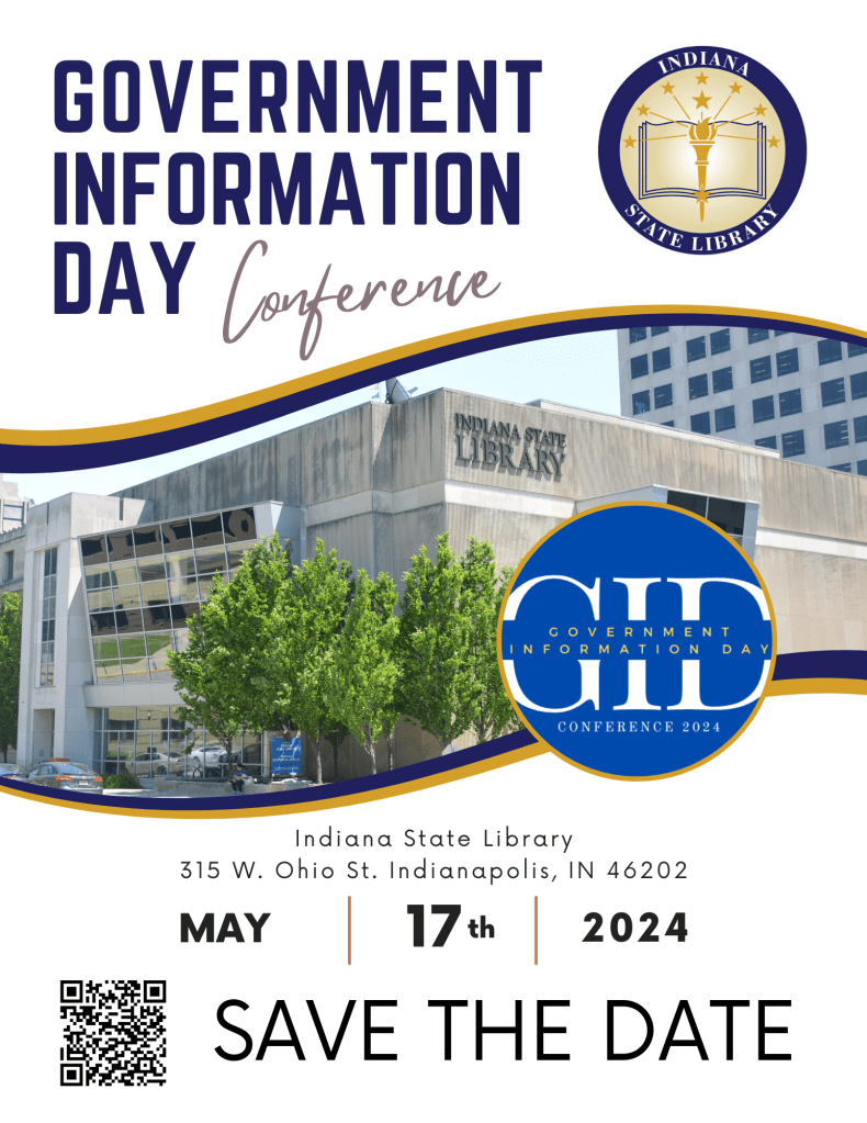 Government Information Day conference will be returning to the Indiana State Library on Friday May 17th, 2024. The free conference will be a 1-day hybrid event (in person and virtual). Planning is underway to offer attendees interesting informative topics that highlight government information and resources from all levels (federal, state, and local). Each session will be eligible for 1 LEU. If there is a topic you would like covered or have any questions, please contact Planning Committee Chair Brent Abercrombie (babercrombie@library.in.gov). Indiana GovInfo will continue to provide updates on GID24 at Government Information Day 2024. We hope to see you there!